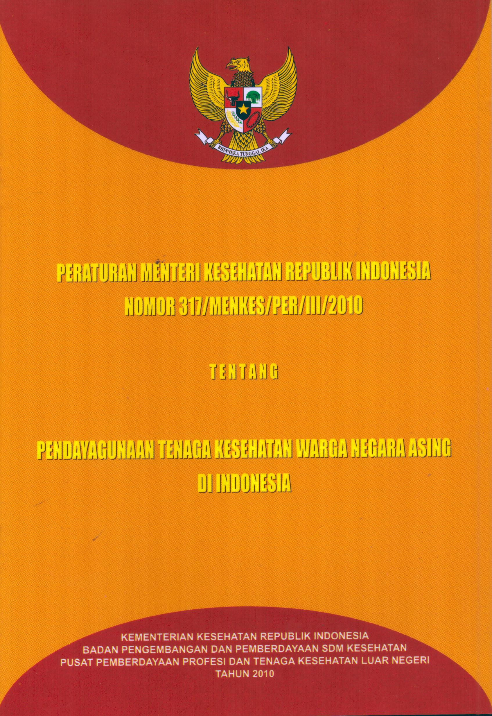 | Judul | Peraturan Menteri Kesehatan Republik Indonesia 317/Menkes/Per/III/2010 : Tentang Pendayagunaan Tenaga Kesehatan Warga Negara Asing di Indonesia / Kementerian Kesehatan Republik Indonesia |